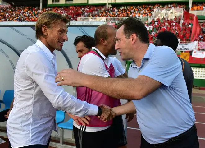 Renard Harve bắt tay Marc Wilmots trong trận quyết đấu Bờ Biển Ngà vs Morocco rạng sáng 12/11.